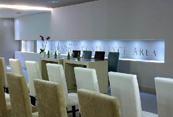 Φωτεινά και ευρύχωρα, τα δωμάτια του Molos Bay είναι εξοπλισμένα με ανατομικά στρώματα, κλιματισμό, μίνι ψυγείο και δορυφορική τηλεόραση. Τα μπάνια περιλαμβάνουν στεγνωτήρα μαλλιών και προϊόντα περιποίησης. Στους κοινόχρηστους χώρους του ξενοδοχείου προσφέρεται δωρεάν Wi-Fi.