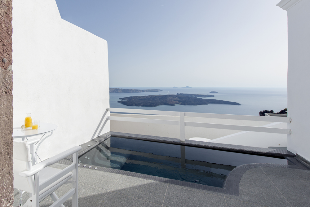 It is consists of romantic and modern style rooms, each one in different color, with private balconies overlooking caldera.