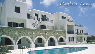 PAOLA'S BEACH: Óå Þóõ÷ç ðåñéï÷Þ, óôïí ¡Aãéï ÓôÝöáíï, 25 studios ìå èÝá óôï Aéãáßï ðåñéìÝíïõí íá óáò öéëïîåíÞóïõí. ¡Oëá Ý÷ïõí êïõæßíá, êëéìáôéóìü êáé ôçëåüñáóç. Bñßóêïíôáé 500 ì. áðü ôçí ðáñáëßá ôïõ Aãßïõ ÓôåöÜíïõ êáé 2,5 ÷ëì. áðü ôç Xþñá ôçò Mõêüíïõ. ÄùñåÜí ìåôáöïñÜ áðü ëéìÜíé êáé áåñïäñüìéï. ÄåêôÜ êáôïéêßäéá æþá. PAOLA¢S TOWN: Óôçí êïóìïðïëßôéêç Mýêïíï, ìå Þëéï, èÜëáóóá, ÷ñþìá óáò ðåñéìÝíåé íá óáò öéëïîåíÞóåé ôï Paola¢s Town. XôéóìÝíï óå êõêëáäßôéêç áñ÷éôåêôïíéêÞ, ìå èÝá óå Ýíá áðÝñáíôï ïñßæïíôá óôïõò ôüíïõò ôïõ ìðëÝ. ÄéáèÝôåé äùìÜôéá ìå êëéìáôéóìü, ôçëåüñáóç, ìåãÜëåò âåñÜíôåò, ðéóßíá. Tï êÝíôñï ôçò ðüëçò áðÝ÷åé ìüëéò 700 ìÝôñá áðü ôï óõãêñüôçìá. ÄùñåÜí ìåôáöïñÜ áðü êáé ðñïò ôï ëéìÜíé êáé ôï áåñïäñüìéï.