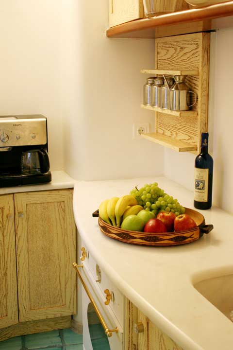 Η βίλα είναι επιπλωμένη, κυρίως, με παραδοσιακά κυκλαδίτικα έπιπλα.