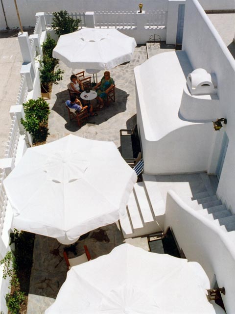 The complex has a patio with tables and umbrellas where you can enjoy your coffee or refreshment with the best Aegean view.