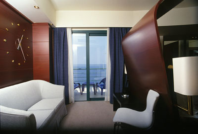 Τα πολυτελή, κλιματιζόμενα δωμάτια διαθέτουν καθιστικό και τηλεόραση επίπεδης οθόνης με δορυφορικά και pay-per-view κανάλια. Περιλαμβάνονται παντόφλες, μπουρνούζια και καλλυντικά. Όλα τα μπαλκόνια έχουν υπέροχη θέα στη θάλασσα ή στα Γεράνεια Όρη.