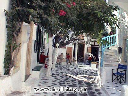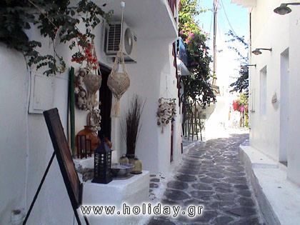 Εντυπωσιάζει με τη λιτή κι απέριττη ομορφιά της. Όποιος την επισκέπτεται για πρώτη φορά γοητεύετε από την ομοιόμορφη αρχιτεκτονική των κατοικιών και των κτιρίων της. Τα στενά καλντερίμια, κύριο χαρακτηριστικό της νησιώτικης αρχιτεκτονικής, οδηγούν άλλοτε στις γειτονιές της Χώρας κι άλλοτε σε πολυσύχναστα σημεία.