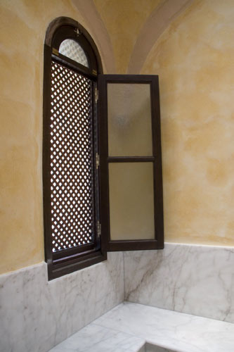 | This suite has features dating from the Ottoman period. There is a hand painted ceiling in the lounge and a separate bedroom with king sized bed. The en-suite has a marble basin and marble bath with shower. There is also a stunning private Hammam with domed ceiling creating an extra serene environment for sheer indulgence.