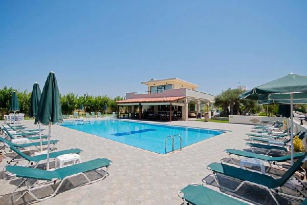 The area is surrounded with many trees and flowers in a large garden with big kiosks near by our big pool, where you can sit and relax having a drink in our bar and it also has a parking place, in order of those who owns a car or a motorbike. You can also enjoy your meals in our restaurant,We can serve you traditional Cretan, Greek and European cuisine