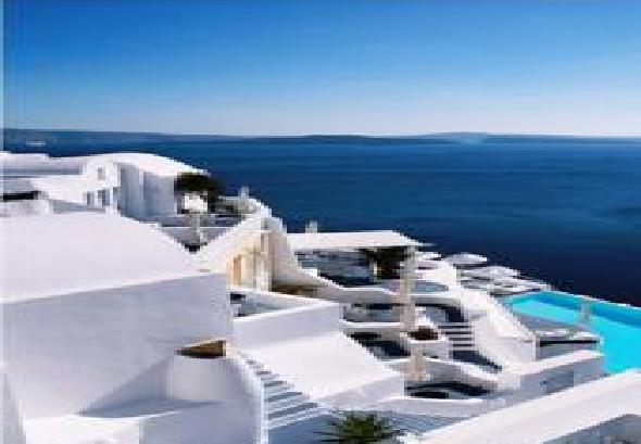 Perched on the cliffs of Oia, 300 feet above the blue waters of the Aegean, Katikies Hotel offers a rooftop restaurant. Its infinity pools enjoy sweeping views of the Caldera.