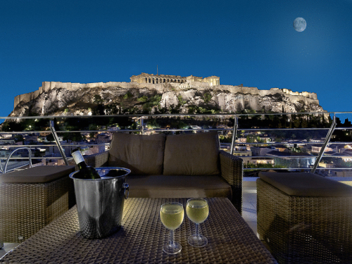 Roof garden viewing the Acropolis and Plaka, 3 blocks away from airport bus terminal and Syntagma metro station (direct line from the airport).