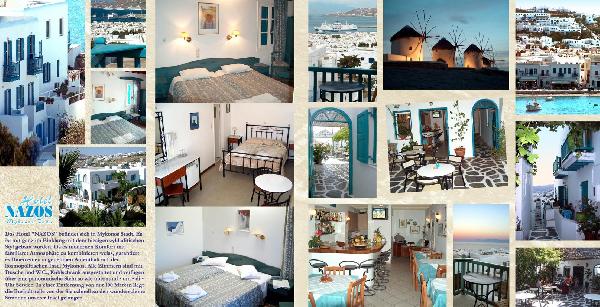 Beautifully located in Mykonos town the Hotel NAZOS is overlooking the bright blue Aegean sea and stunning Cycladic landscapes, within easy walking distance of unspoilt beaches and the charming Old Mykonos Town, with its tiny houses and maze-like streets, Hotel Nazos warmly welcomes guests with a friendly Greek atmosphere and hospitality.