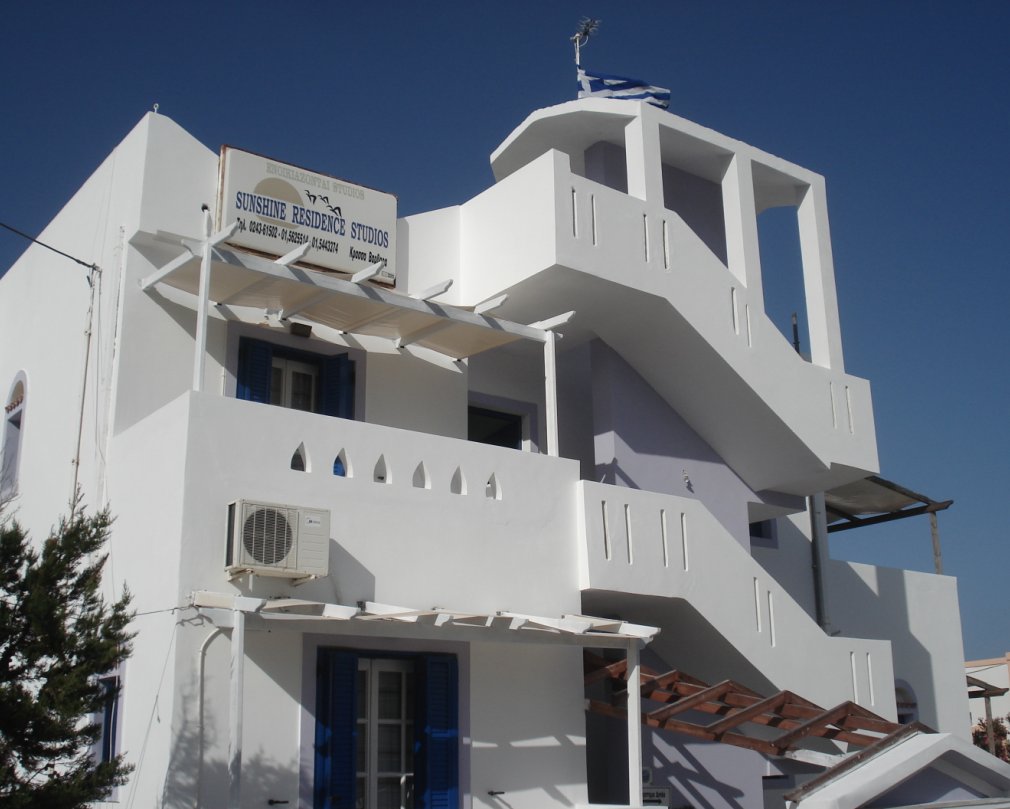 Once you reach the most beautiful and characteristic part of the island, on the right you will see the road that leads to the Sunshine Residence which is located on a small hill about 150 meters from the sea. From the windows and small characteristic balconies of this small, welcoming and comfortable Residence, one can enjoy the beautiful view of the bay, for many the most beautiful of the island, with unforgettable sunrises and sunsets.