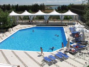 Make yourselves at home in our 102 comfortable rooms with view to Aegean or the evergreen northern Greek scenery. All rooms have private bath either bathtub or shower, air condition, TV, piped music, direct dial phone with private answering service, refrigerator and mini bar, private furnished balcony or veranda. Internet access is available upon request.