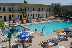 This 2-floor bungalow style hotel complex has 84 spacious double rooms, Reception, Mini Market, comfortable lobby, Bar/Pool Bar, TV-Room, Game room, Restaurant and a beautiful terrace. The rooms are furnished in a local style with bath/WC, Air-condition, radio/music, direct telephone and terrace or balcony. Mini refrigerators and TV sets are also available upon request. The hotel is located 25km from Rhodes town and 20km from Lindos, in the well known tourism area of Kolymbia. A lot of shops, restaurants, cafe and traditional fish-taverns are around the hotel and in the nearby shopping center. . The sandy beach is about 350m. away and there are water sport activities available. Our hotel provides an improved and integrated ALL-INCLUSIVE package.