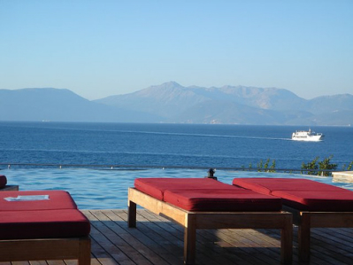 The outdoor pool, restaurant and lounge bar are set on a wide, sea-facing terrace.