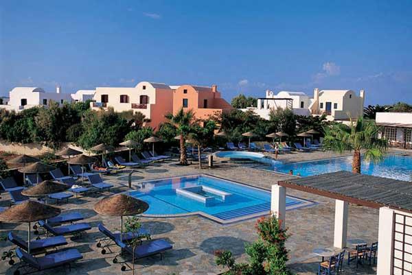 The Cycladic architectural style is structurally and advantageously developed here, in the nine buildings, each of which bears the name of one of the Muses. The hotel is situated near the village of Perissa and 150 m. from the Black Beach, which stretches, sandy and inviting, for 9 km. There you can find, in a specially arranged area, umbrellas and deck chairs.