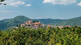 The village rises gently along a ridge, its stone houses clustered together as if shaped by the contours of the land itself. Narrow lanes wind between centuries-old buildings, opening occasionally to wide views over soft green hills that shift in tone with the seasons. In autumn, the landscape becomes especially striking, with warm colors settling over the countryside and the air carrying the scent of harvest.