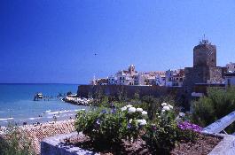 The old town is perched on a small promontory, enclosed by defensive walls that once protected it from seaborne threats. Within these walls, narrow streets wind between closely set houses, their pale façades reflecting the strong southern light. At the edge stands the Castello Svevo, a solid, square structure that overlooks both the sea and the newer parts of the town, reinforcing the layered transition between past and present.
