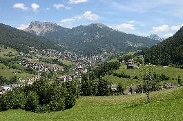 The architecture reflects a blend of alpine and Italian influences, with wooden balconies, painted façades, and carefully maintained buildings that give the town a warm, cohesive appearance. The center is compact and pedestrian-friendly, with open spaces that allow clear views toward the surrounding mountains, which seem to rise almost immediately beyond the edges of the town.