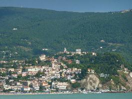 The town is divided between an upper, older section and a lower area closer to the water. Above, narrow streets and small squares open onto panoramic terraces with sweeping sea views, while below, beaches stretch along the shoreline, alternating between pebbled coves and softer sandy areas. The nearby Monte Conero frames the entire setting, its green slopes descending sharply toward the coast.