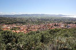 The town itself sits slightly inland on a gentle rise, surrounded by rolling hills, vineyards, and Mediterranean scrub. From here, the land slopes down toward one of the island¢s most extensive beaches—a broad, uninterrupted stretch of pale sand that runs for kilometers along the coast. The water is clear and often windswept, giving the shoreline a dynamic, ever-changing character.