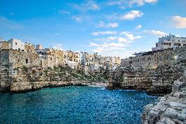 Polignano a Mare is a dramatic coastal town in southern Italy where white limestone cliffs rise directly above the Adriatic Sea, creating one of the most visually striking urban-coastal interfaces in the country. The town feels carved into the rock itself—tight streets, sudden balconies, and openings in the stone that reveal abrupt, luminous views of open water.