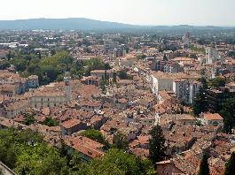 The historic core gathers beneath the hilltop Gorizia Castle, a medieval fortress that overlooks both the Italian town and the Slovenian city of Nova Gorica. From its elevated position, the view reveals a landscape of gentle hills, tiled roofs, and a subtle blending of cultures rather than a sharp division.
