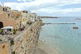 Beyond the walls, the coastline becomes more expansive and elemental. To the south, the landscape transitions into the protected area of Alimini Lakes and a series of beaches backed by dunes and pine forests. The water here is clear and often intensely blue, shifting with depth and light, while the terrain alternates between sandy stretches and low rocky outcrops.