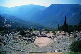 Delphi with a population of 1,500, is one of the most beautiful and impressing landscapes of Greece, and the centre -"o m p h a l o s "- of the world, according to the ancient myth. It was already inhabited in the prehistoric times and later -especially during the classic times- obtained great historic importance, as it has been linked with the most significant events of Greek history. Apollo, the God of catharsis and the genuine oracle, dominated earlier forms of worship in the Delphi. He taught people the "metron", that is prudence and modesty, which became the most ethical and peaceful expression of the Greek spirit. The famous O r a c l e of Delphi, where the god's divination was given through the mouth of Pythia, was directed by the so-called priesthood, that is priests with deep mystic education. Moreover, Delphi with the renowned Amphictyonic institution, gave the signal for friendship, brotherhood and peaceful coexistence of peoples, as a fundamental goal of the Delphic idea . A quite spectacular proof of the world-wide prestige enjoyed by the temple of the God of Light was the amount of votive offerings by leaders, towns and rich citizens, great in both quality and artistic value; unfortunately, very few of them have survived through the time.