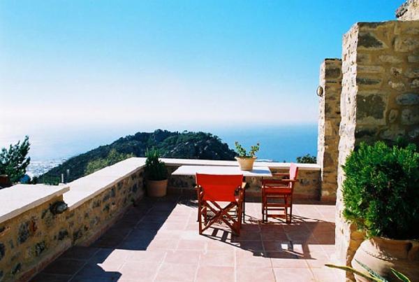 It is laid out in one level, with its back façade (where the main entrance gate) towards the old market street and two other facades looking towards east and the sea. Its main façade opens to a side courtyard of 17m2, that has a second gate door to a narrow walkway. An exterior stair leads to a 45m2 top view terrace with splendid views to the sea.. In front of the house extends another village house in ruins (in a lower level), mixing up antiquity with today’ s life.