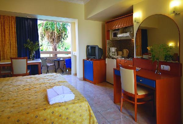 The stylishly furnished and fully equipped studios are one-room self-catering units accommodating up to three adults in three twin beds. Studios are furnished with private balcony or terrace, bathroom with bath and shower attachment, hairdryer, safe deposit box in the wardrobe on a charge, international direct dial telephones in bedroom & bathroom, writing desk corner, internet access, remote controlled colour TV with satellite and radio channels, heating and air conditioning centrally controlled (June -September), sound proof windows, magnetic key cards and smoke detector in bedroom. Moreover, fridge, dining table & chairs, kitchenette and cooking rings, microwaves, filter coffee machine, blender, toaster & kettle.