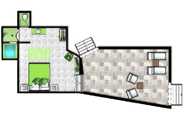 Green like a lagoon in a cave, designed for those who want to hide away for a couple of days. The bathroom, dressed with green mosaic leads to the indoor atmospheric heated Jacuzzi nested in a deep domed cave. Light up the candles, relax, and let yourself enjoy the feeling. Located in the upper level of the complex, Lagoon Suite has a nearly step less access. The large terrace with the comfy sun loungers and wing chairs, allow you to have a stunning panoramic view to the volcano and sunset. Enjoy a romantic candlelight dinner under the stars and wish that this fairy tale will never end.