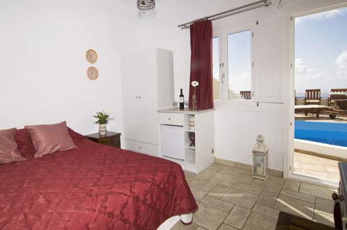 It is compact in size. It provides you with a view towards the Volcano and Caldera gulf, a private bathroom, refrigerator, air-conditioning and high-tech amenities such as free high speed Wi-Fi, LCD flat-screen, satellite TV and radio and DVD-mp3 player.