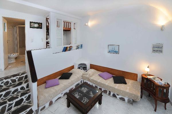 The junior suite is a very nice villa built in two levels. The one has a double bedroom with a wooden loft in it and a bathroom and the other has a living room with two sofas that may be used as beds. It is very comfortable and it contains hand made island furniture and a king size bed, built by stones from the volcano. It offers privacy as it has private entrance and balcony with a panoramic view of the pool, the sea and the volcano.