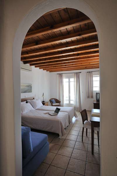 Our Superior Ornos rooms are very spacious with two single beds or one king size bed and sitting area with a couch –bed. The furniture is elegant with typical Cycladic style and colours. Our rooms in Ornos, Mykonos, can accommodate up to 4 people (30-35 sqm).
