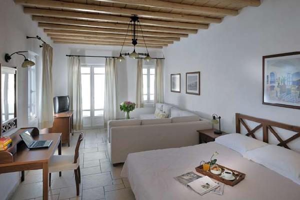 The very spacious junior Ornos suites with sitting area and couch bed offer the perfect home filling. The terrace with the sitting area offers a breath taking view over Ornos bay. The guest can choose either two single beds or one king side bed. Our luxury Ornos suites can accommodate up to 5 people (40sqm).